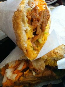I made it just in time because they were closing as they were making my order. While I wanted to compare them to Korilla, I didn’t want to get a burrito, so I went with the sweet and spicy pork bahn-mi sandwich on a crusty french baguette. This sandwich is huge. This is a legit foot long (if not more). The meat had a great seasoning and the sauce they use was delicious. I ate the first half and realized I had not added the red hot sauce that they dropped in my bag. I wish I had discovered this when eating my first half because it upped the delicious factor by 2.