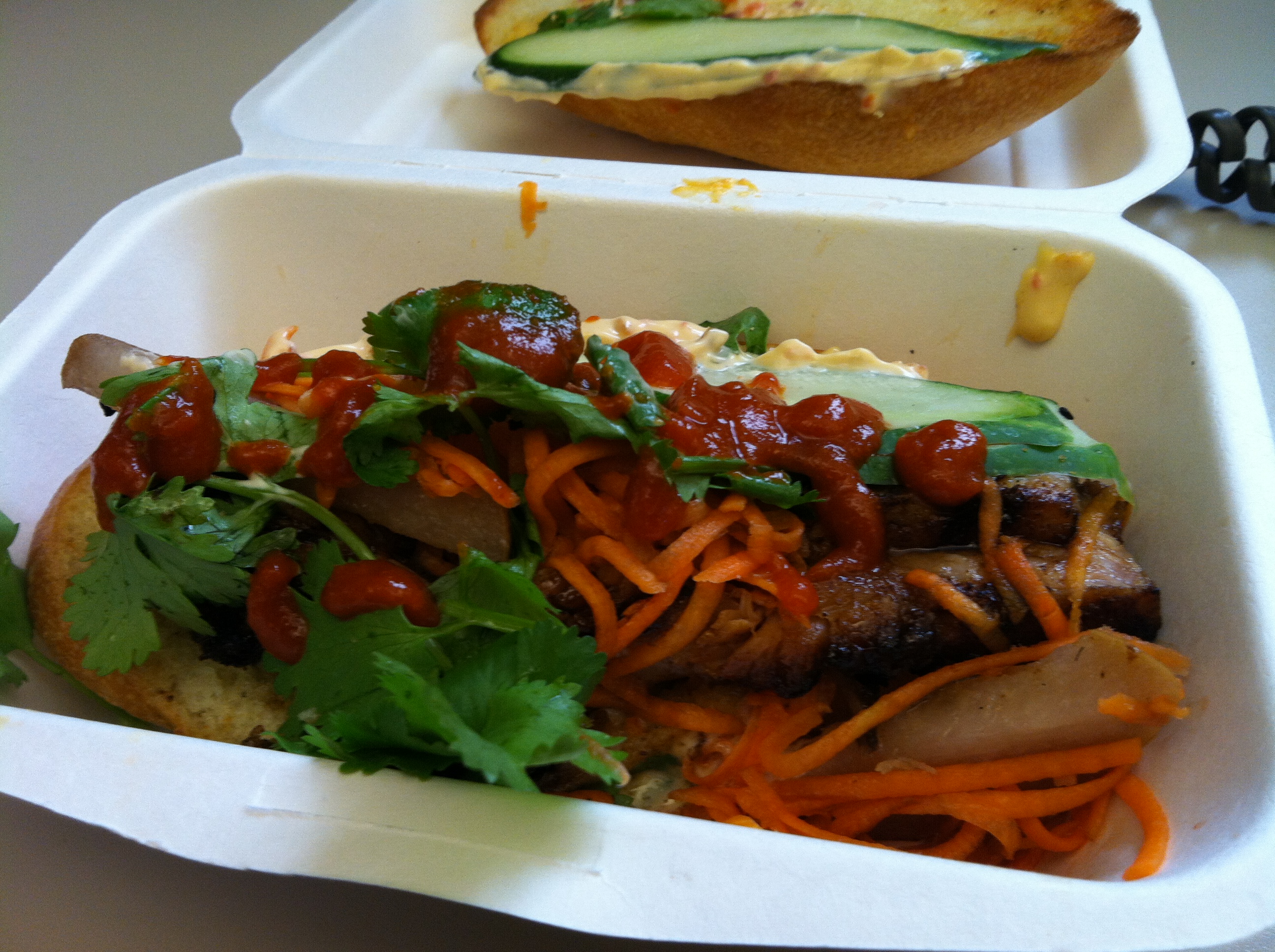 Num Pang is a sandwich shop with roots in Cambodian style cooking. All the sandwiches are served on a semolina flour baguette (baked fresh daily) and topped with cucumber, pickled carrots, cilantro and chili mayo. So, which of the mouthwatering options caught my eye on this particular day? Five-Spice Glazed Pork Belly with pickled Asian pear ($8.00).