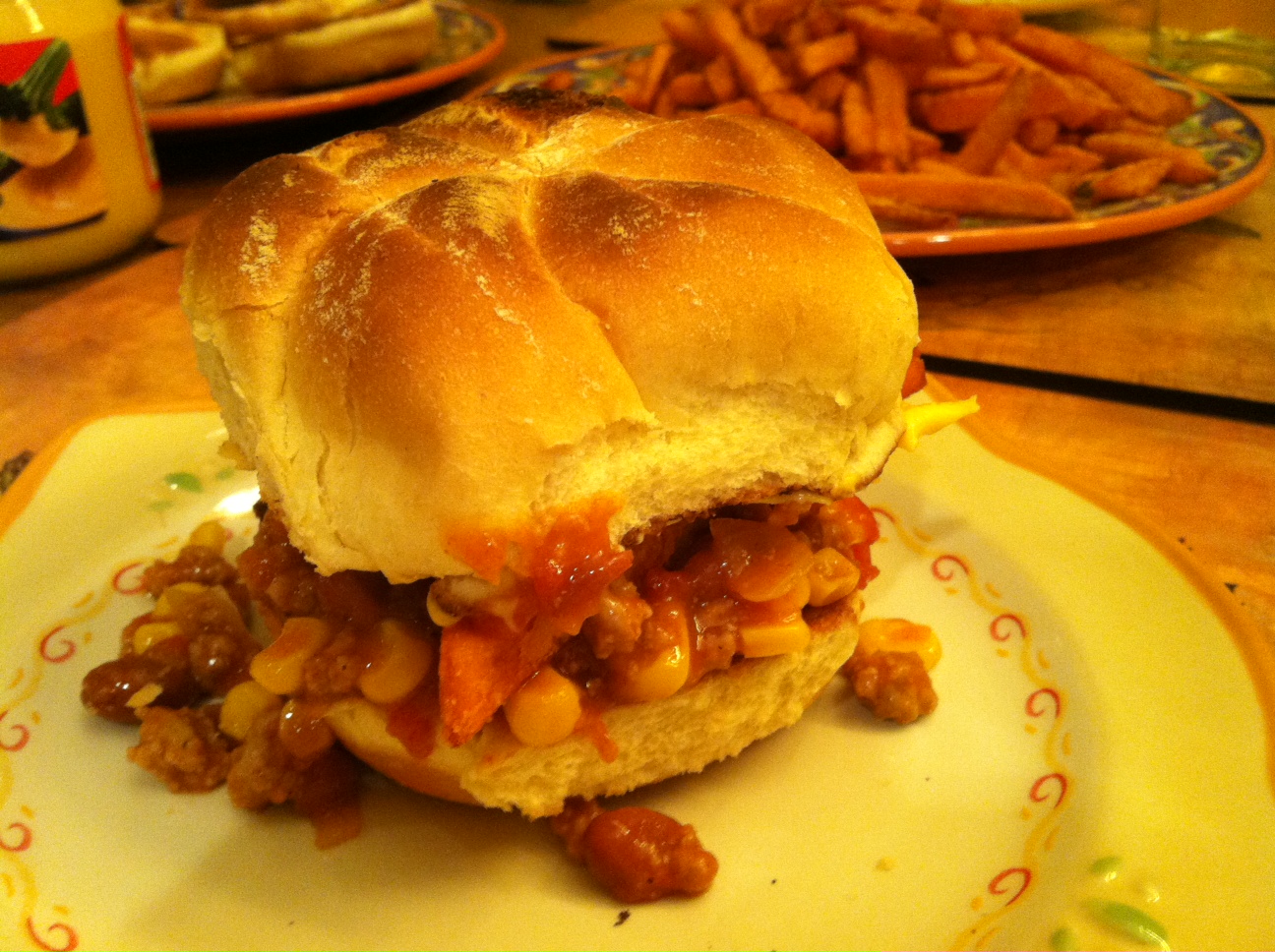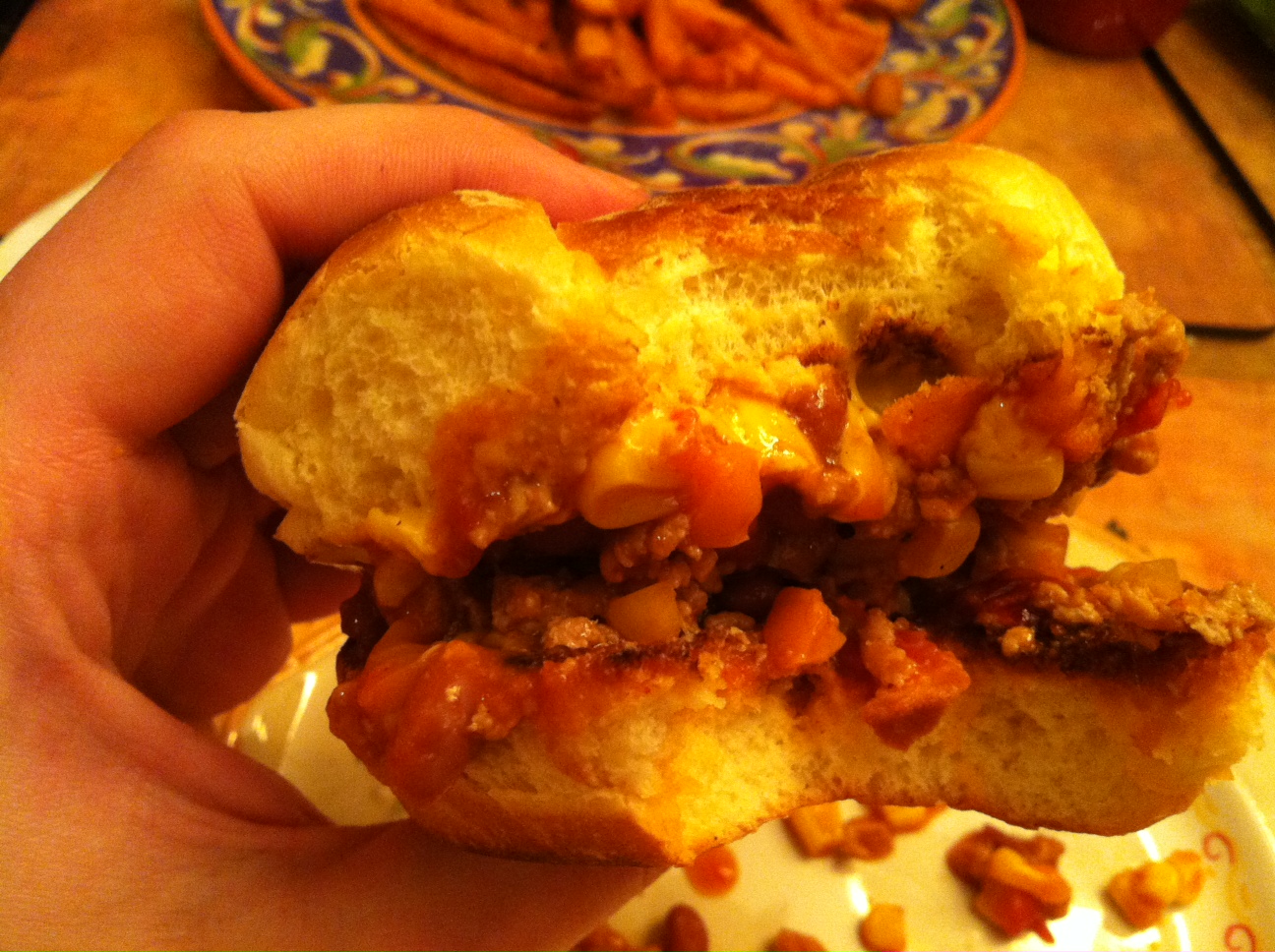 Top your toasty bun witWhiz, fill with chili, and pile on some sweet potato fries.