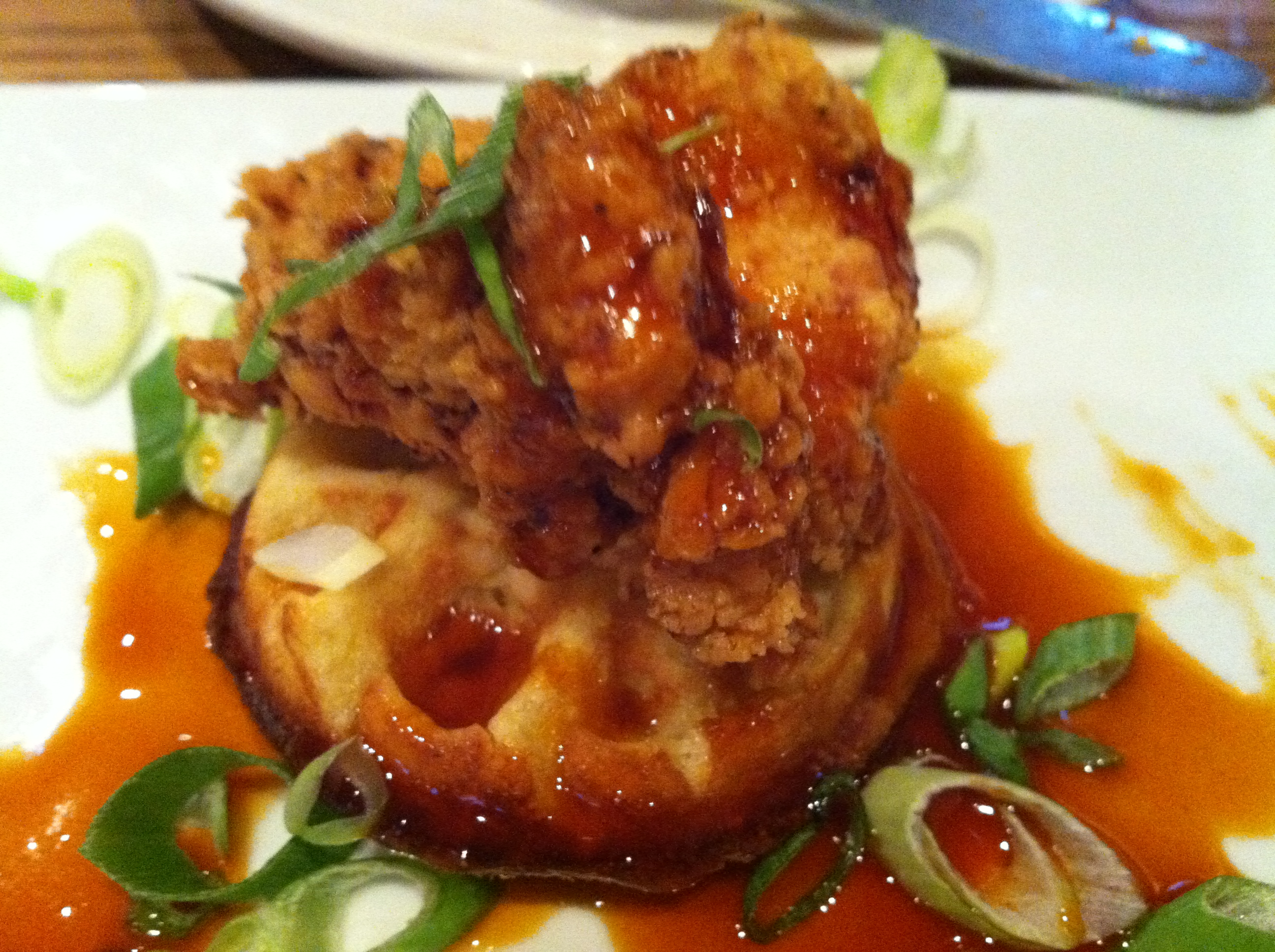 We exchanged stories about how old we felt and how quickly time tends to get away from us (last time we got together we agreed to meet up once a month… that was six months ago). As we sat there we both got hungry and were debating eating at the bar or walking over to BonChon… which has the most awesome twice fried Korean wings. Fearing we might not find a seat and lose out on great brews we decided to get some apps off the menu. Philly Cheese Steak Spring Rolls, Sliders, Deviled Eggs (with bacon!) and the star of this meal… mini fried chicken and waffles (4 more servings, please!).