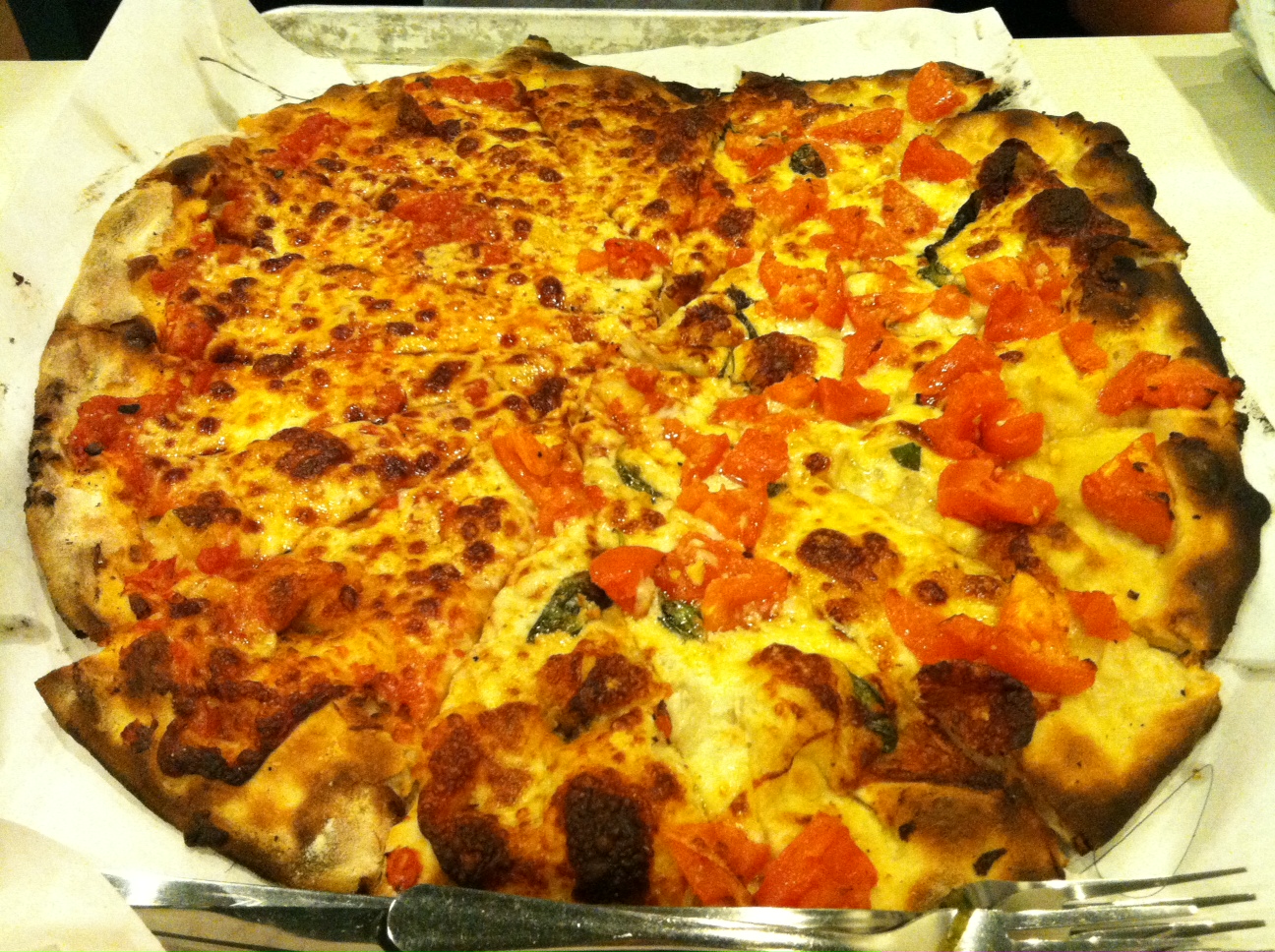 We ordered the infamous white clam pizza and another pizza, half fresh tomato and half original with mozzarella. When the pizza came out the pies are cut into 16 slices and are all different sizes. At first I thought it was all wrong, but I soon realized it was the best idea ever. It made it easier to taste test each without getting too full and as you near the border of Glutton you start choosing the smaller slices.