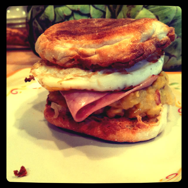 I like to get creative, so one morning I made this breakfast sandwich. What is it? It’s an egg (over easy) and fried ham sitting on top of mangu… all wrapped up in a toasted English muffin with butter. Fat attack? You better believe it. Delicious? Heck yea!